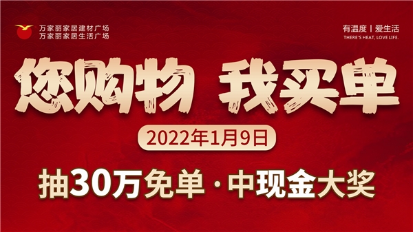 万家丽“你购物 我买单 ”大型回馈新老顾客活动将于2022年1月9日抽奖!凡2021年10月8日-2022年1月9日在万家丽家居建材广场&家居生活广场任意门店下单的顾客在建材、家居前台兑换奖券即可参与抽奖活动!抽30万免单 中现金大奖,更有新年福利、名品豪奖等超多惊喜等着你!咨询热线:0731—82662000(建材)0731—85537788(家居)
