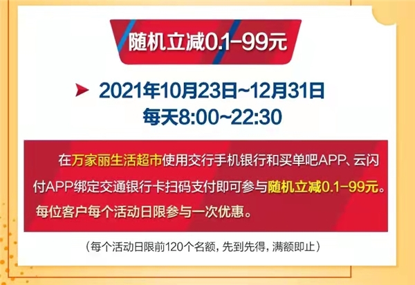 10月23日—12月31日,每周五、周六8:00—22:30,在万家丽生活超市使用交通银行和买单吧APP、云闪付APP绑定交通银行扫码支付优享满88元减20元优惠,还可同时参与随机立减活动,最高可减99元,名额有限,先到先得!10月30日—10月31日,积分兑换活动火爆来袭!抽纸、洗衣液等缤纷好礼等你来兑礼!万家丽生活超市位于万家丽国际MALL地铁层,地铁2、5号线直达卖场,每周二周三会员日享受全场商品8.5折优惠,更有不定期的好礼相送,要购物要囤货就来万家丽生活超市!