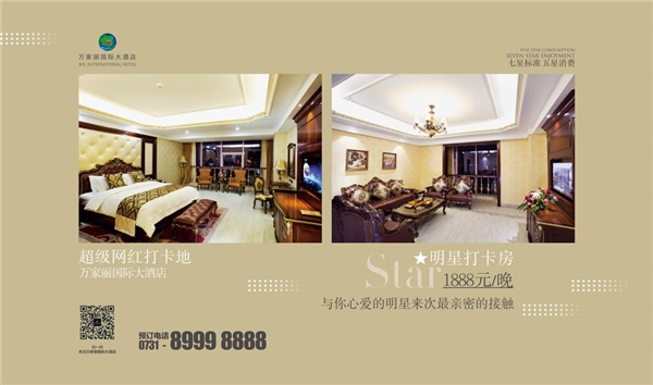 万家丽国际大酒店是一家七星设计标准五星收费的作品、特色、地标、文化酒店,以及其拥有的独特十四大优势,成为湖南乃至我国中部地区最有优势、网络销量排名第一的酒店!来超级万红打卡地,与你心爱的明星来次最亲密的接触,现推出明星打卡房,仅需1888元/晚,更多活动详情请关注万家丽国际大酒店微信公众号!