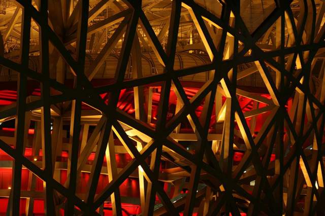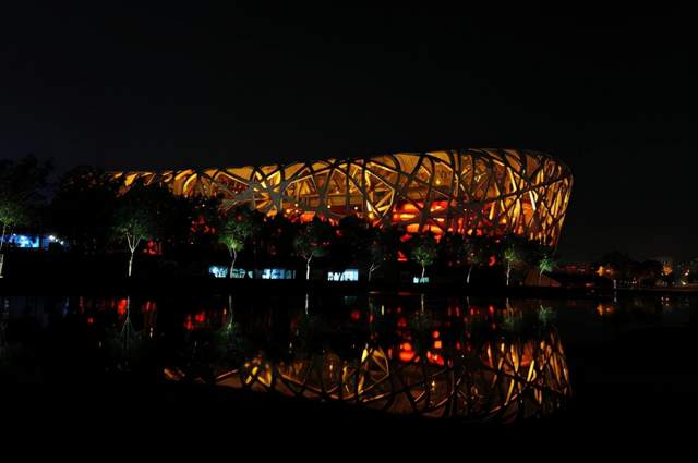 用特制LED灯具照亮红墙,用投光灯向外照射钢结构,形成场馆内亮外暗的视效,华艺还实现了鸟巢的另一个文化主题的呈现——“剪影”。