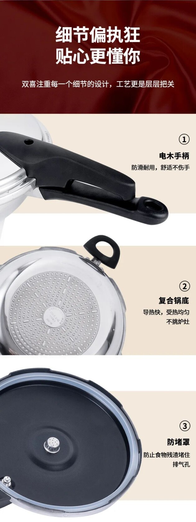 大家买压力锅特别担心的就是安全问题市面上压力锅的新闻不少,很多独居女孩都望而却步,双喜这款多功能压力锅采用八重安全防护、一体式设计,比常规压力锅更牢固,更密封,也更保险!!