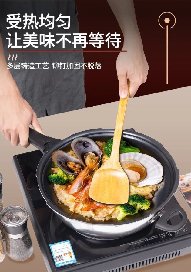 自带新型铝合金材料,受热均匀,快速入味,烹饪过程更少油烟。430导磁不锈钢复底,导热快,受热更均匀,好锅不挑灶。