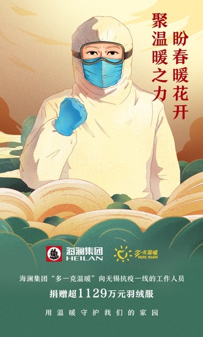据了解,海澜之家在获悉疫情的当天,立即决定启动今年首次“多一克温暖”公益行动,连夜紧急筹备总价值超1129万元的羽绒服,通过红十字会捐赠至抗疫一线。为众人抱薪者,不可使其受冻于冰雪。抗疫英雄守护我们的平安,就有人守护他们的温暖。作为国民品牌的海澜之家,一直心怀家国情怀,作为无锡本地龙头企业,更是义不容辞,用“多一克温暖”的火热,抵御着疫情的严寒。