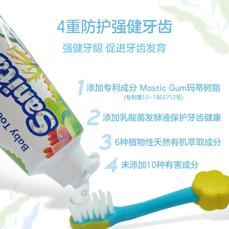 益生菌除了能够呵护宝宝肠胃,同时也能够保护口腔健康。Denti莎卡儿童牙膏特别添加了乳酸菌发酵液,乳酸菌在口腔内稳定性很强,能够粘附在口腔上,抑制细菌滋生,帮助宝宝平衡口腔菌群,让牙齿健康成长。芒果味和复合果味的新品还特别添加了玛蒂树脂专利成分,可以有效抑制幽门螺旋杆菌的滋长,细心保护宝宝稚嫩的口腔。