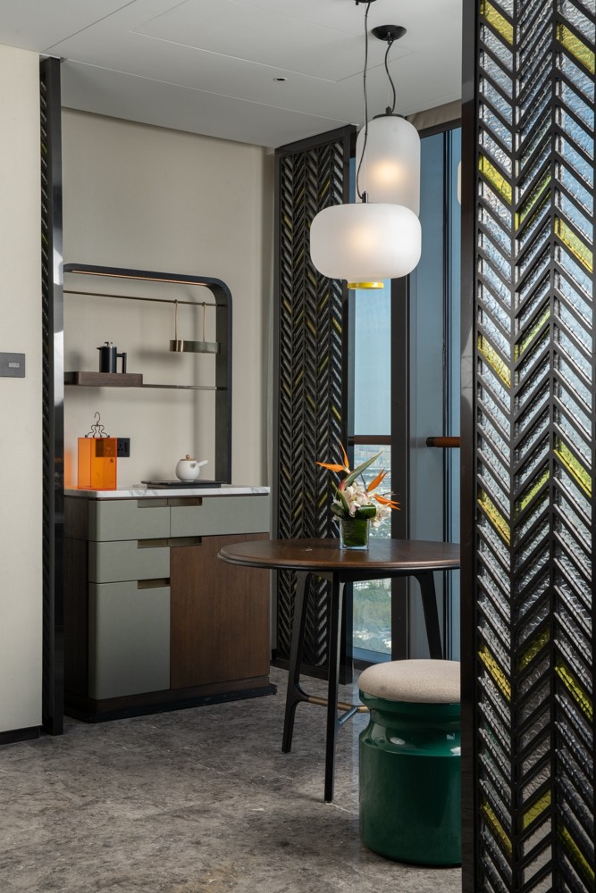 房间内的色调都来自苏州古典园林中的经典元素,这些材料经过精心设计就像是当地古典园林的缩影。整个空间使用的木材均带有纹理丰富且风格质朴的质感,仿佛园林中的传统建筑。浴室墙壁上镶嵌着的本土灰色砖块,与梳妆台和淋浴间的石头形成对比。Canvas艺术品顾问的呈现同样深受苏州园林的影响,仿佛漂浮在园林池塘中的莲花。同样的,家具也经过专门定制,这些定制件在明代古家具的基础上融合了现代风格。迷你吧作为园林景观的一部分,它的灵感来源于人们野餐时通常会带的传统午餐盒。