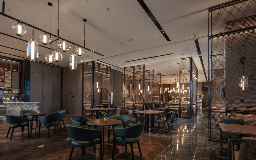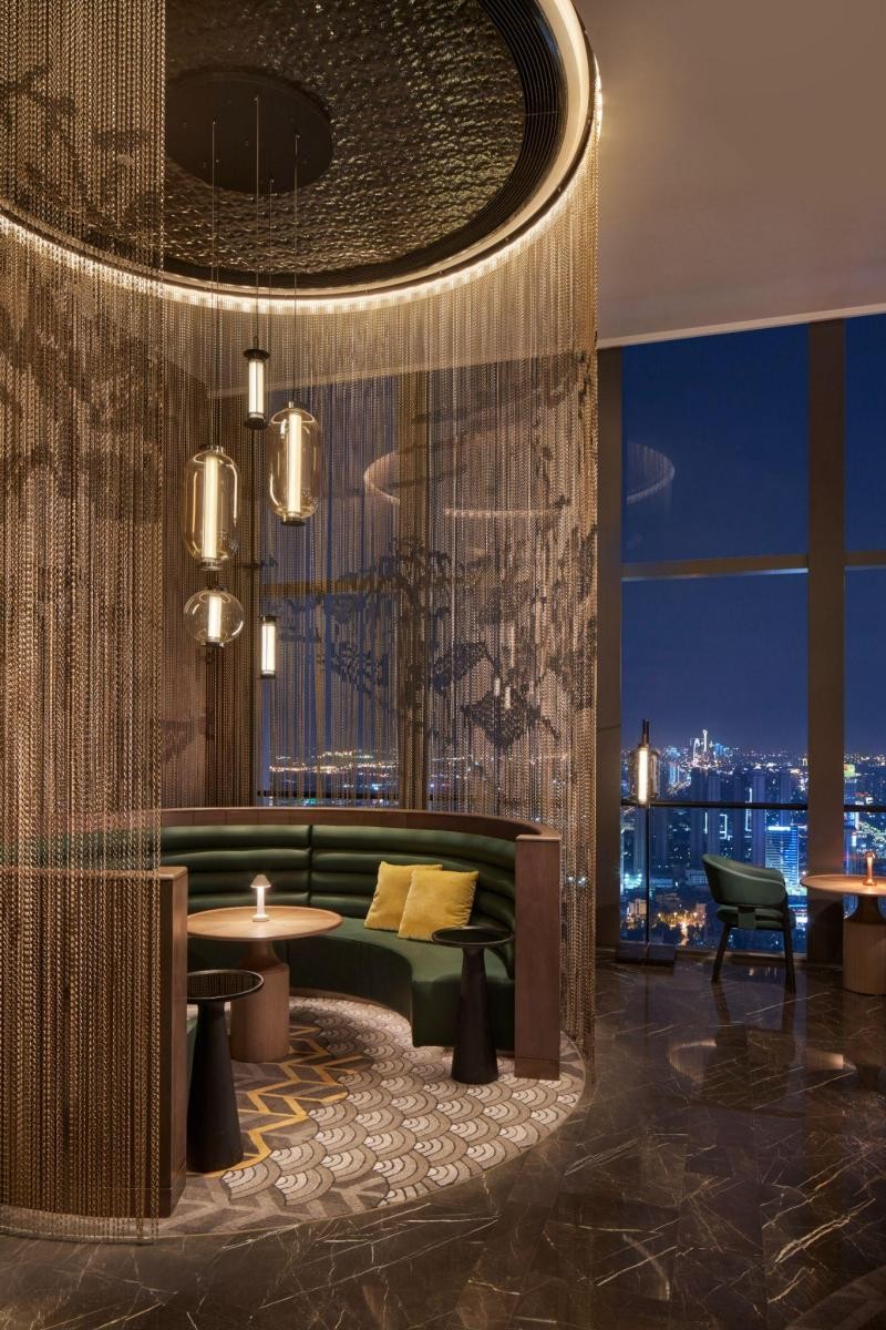 高耸的滑门将邻里餐厅和酒吧分开,客人可以选择在酒吧享用定制的鸡尾酒,也可以在此过淡雅闲适的下午。各不相同的座位安排贯穿整个空间:窗户旁的椅子提供了欣赏城市现代化天际线的奇观和夜景的机会。与此同时,室内设计团队与Canvas艺术品顾问合作,创造了圆形茧状座位,安装在由许多金属细链组成的垂帘之中,构成苏州古城景观中传统房屋的造型,提供了不同的城市视角。