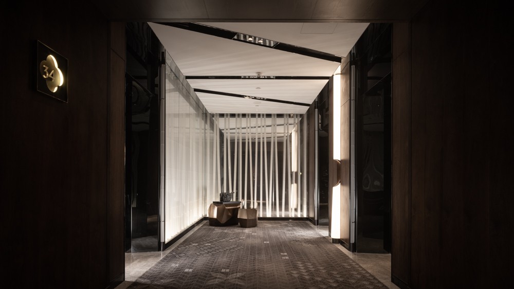 到达入住层后,步入电梯厅,客人立即被幽暗的木质走廊所包围,感受到一种进入竹林般的宁静氛围。Light Directions团队将聚光灯隐藏在透明竹竿底部,这些竹竿从墙上无限镜面中反射出的深邃光线,营造出柔和的空间氛围。地板上的地毯经过定制设计,图案取自传统苏州园林的瓷砖和地板。角落里摆放着的青铜岩石,作为宾客等候时的观赏雕塑。明亮的墙壁用深色木框修饰,使得对比鲜明的黑白主题沿着走廊不断延伸,而竹质灯具的光线沿着墙壁勾勒出线索,为此后即将发生的故事埋下伏笔。