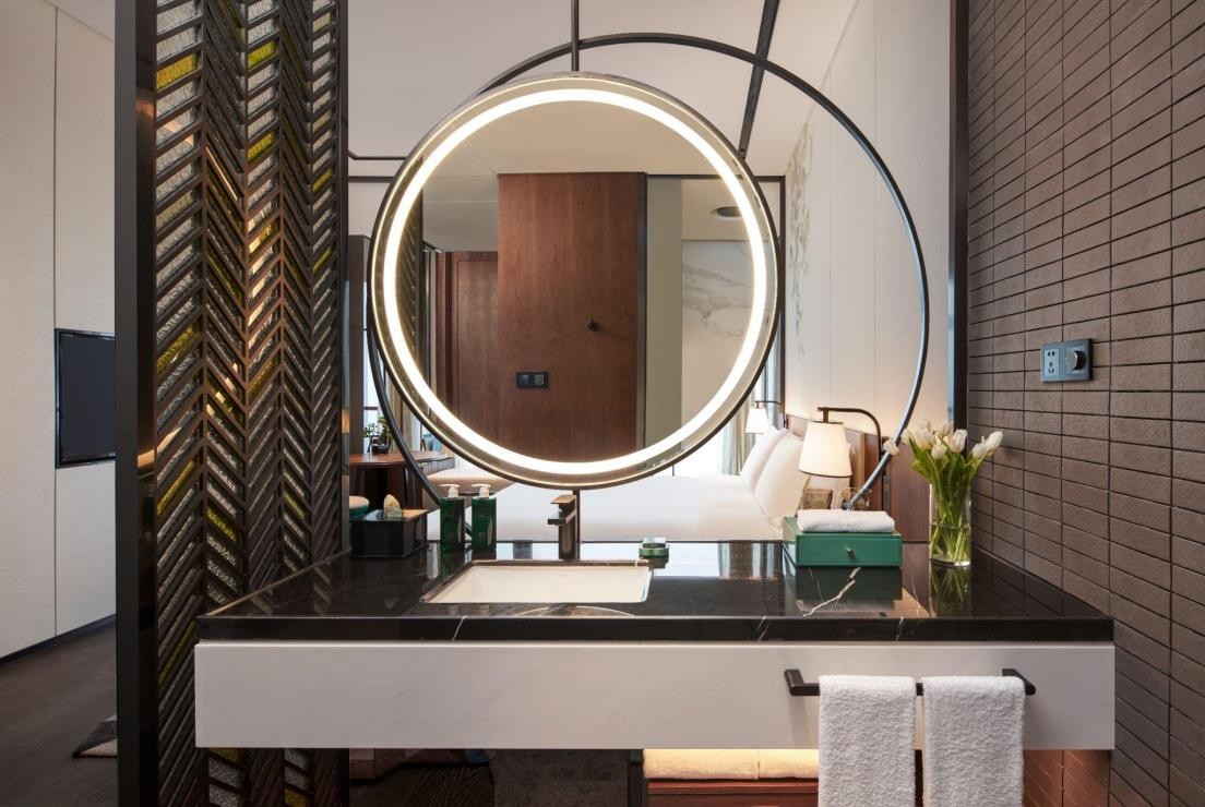 入住后,客人即可在苏州古运河英迪格酒店276间豪华舒适的客房中尽情享受。客房建筑与走廊中引入的主题相结合,运用苏州美丽而精心规划的园林构造,在空间的不同区域将过滤景观和框架景观组合起来。室内设计团队从苏式园林花窗所创造的轮廓中汲取灵感,将屏风与彩色玻璃镶嵌在一起,过滤对浴室的视线,既能保证隐私,又能在两个房间之间形成鲜明的照明对比。一面圆形镜子悬挂在浴室的岛式梳妆台上,与屏风并立,将卧室的景观嵌入框内。