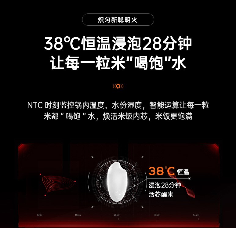 煮饭前要用水泡上半个小时左右,是很多老一辈人留下来的煮饭智慧。苏泊尔远红外电饭煲沿袭古早煮饭智慧,搭载活芯聪明火烹饪曲线,能让米粒在38度恒温水中浸泡28分钟,确保米粒达到黄金含水率,让米饭在膨胀率、含水率、糖化率上拥有更出众的表现。