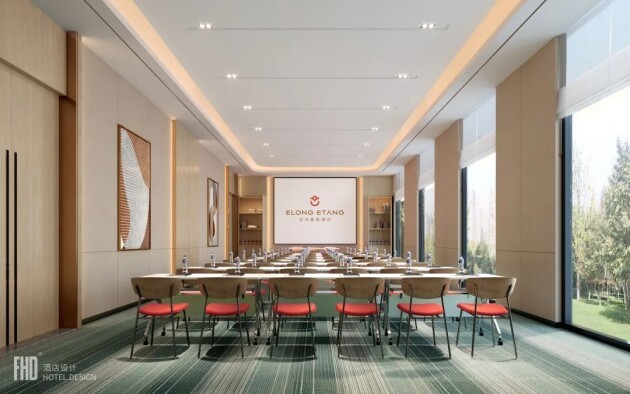 抛弃繁杂的布局方式,实现空间利用的最大化。FHD酒店设计设置简约小巧的双头筒灯作为主要照明,配备超大落地窗,以及满铺墨绿色系线纹地毯,形成纵向延伸之感,从而让会议室更显开阔敞亮。