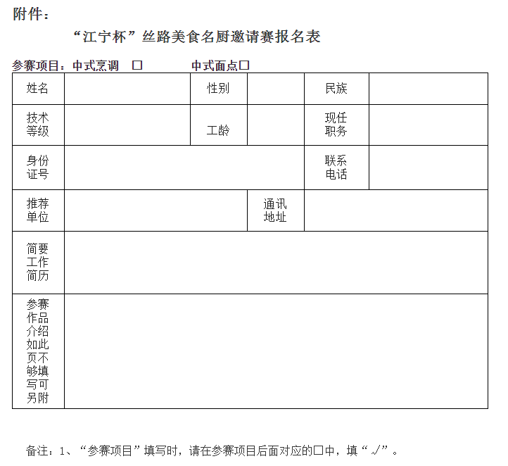附件:“江宁杯”丝路美食名厨邀请赛报名表