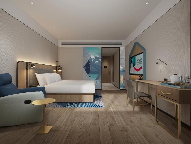 随着”颜值经济”无处不在地提升我们的审美,东呈集团持续赋能产品力的迭代升级,未来宜尚酒店3.0全新视觉将给消费者带来更多产品惊喜。品牌以温暖的微笑曲线重塑品牌概念,图形、色彩将以更轻快的方式融入酒店房卡、灯具、墙布等酒店物资中,灵动大堂空间、花园餐厅、现代轻尚客房,贴心圆角设计等,打造一个轻松和愉悦的空间氛围,宜尚酒店的品牌格调因色彩和设计而诞生新的突破,向大众展示中档酒店高品质住宿体验。