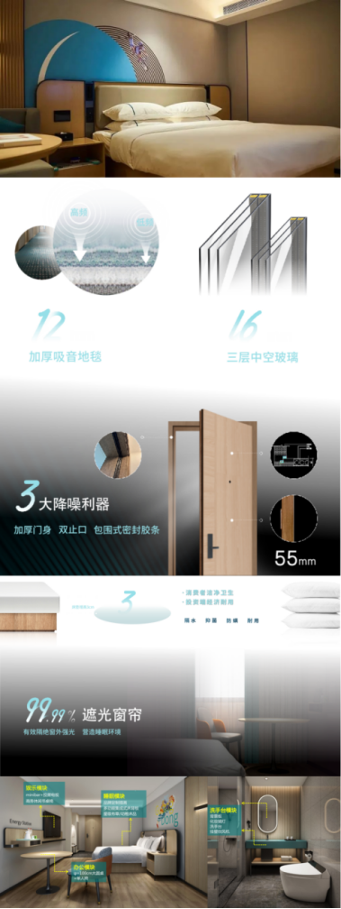 隔音问题向来是经济型酒店备受诟病的老大难题,因此城市便捷4.0在隔音上做了大量技术储备和产品改进,打造出专业的隔音系统,为住户带来一个宁静睡眠: