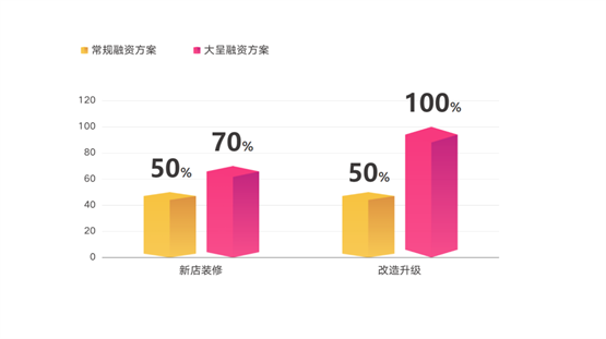 首先是融资比例。市场上的常规方案为50%封顶,大呈金服的方案目前最高可以做到新店70%,改造升级门店最高可做到100%。