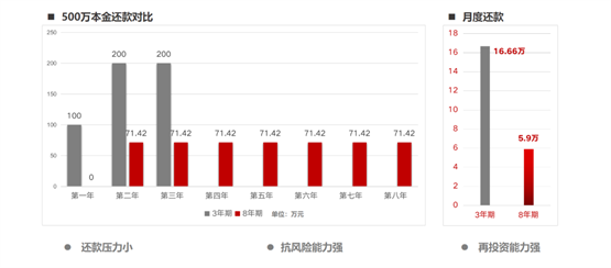 其次是还款期限。同样的500万本金贷款,市场上通常是3年期产品为主;但通过大呈金服的方案可以最高申请8年还款期限,月还款金额从16.66万降到5.9万,提前还款也是0违约金。