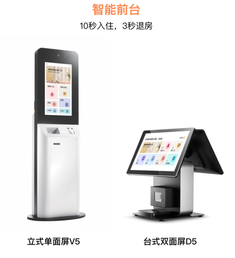 本次为竞鹅酒店提供的酒店智能前台为D5,该款设备采用双面屏设计,外接发卡机箱,适用各类不同的酒店场景,既可由前台辅助操作为住客办理入住,也可以一体独立,由住客自行办理入住。除D5外,沃享住还有立式V5+以及发卡机箱Z4等型号的智能前台,满足低、中、高不同档次酒店的需求。