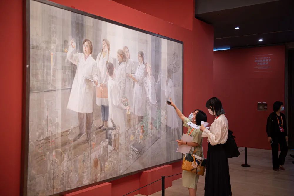 观众在北京中国美术馆观看第十三届中国艺术节全国优秀美术作品展览中的作品《呦呦鹿鸣》(2022年9月2日摄)。新华社记者 陈钟昊 摄