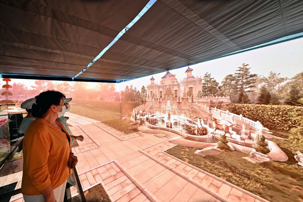 参观者在2022年中国国际服务贸易交易会文旅服务专题展良业夜游展台的《千机圆明》沉浸体验空间内欣赏数字技术模拟的圆明园景象(2022年9月5日摄)。新华社记者 李鑫 摄