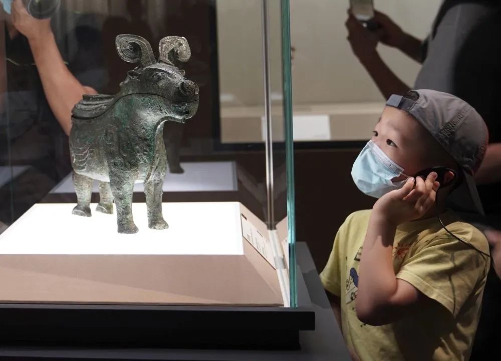 小朋友在上海博物馆举行的“宅兹中国——河南夏商周三代文明展”上参观(2022年7月30日摄)。新华社记者 任珑 摄