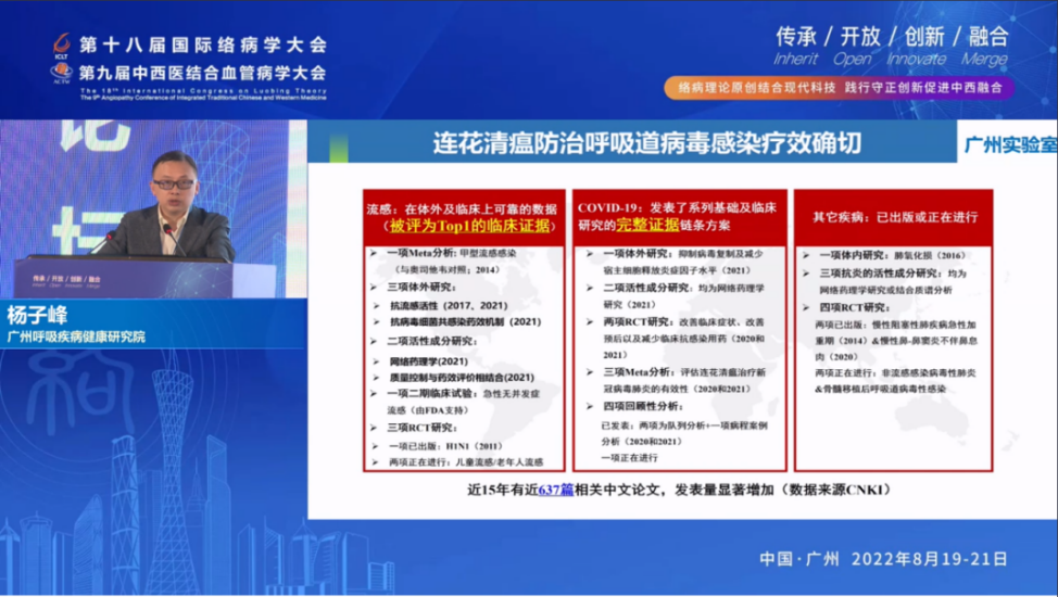 钟南山院士表示,呼吸疾病论坛让中医跟西医共同联合,在络病理论框架下,对呼吸系统疾病及其规律、防控等做深入的了解和交流。近年来,随着大量循证医学研究的开展,中药在呼吸系统疾病方面的广谱抗病毒作用得到了科学证实。连花清瘟等中成药在防治新冠肺炎、流感等呼吸道传染病的良好疗效被广泛认可,成为我国中医药抗疫划时代的重大成果。