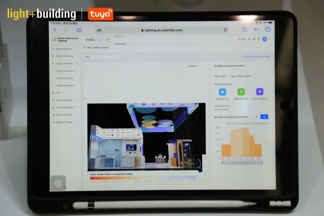 展会现场,商用照明的Kumux人因照明控制策略受到观众的追问和好评。涂鸦商用照明管理后台与Kumux算法模型深入融合,围绕空间用途、项目经纬度等因素,持续优化灯光效果,时刻赋能客户为用户提供动态、健康的人因照明,改善精神及工作、睡眠状态。据统计还能节约大约40%的电量。