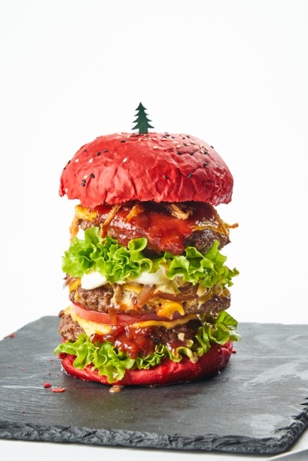 其中,"红”牛哞哞巨诞堡”由三层美味多汁的牛肉饼以及奶酪、生菜、番茄和洋葱等所有经典配料精心搭配而成。