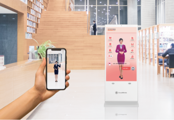 以营业厅场景为例,达闼Cloudia可担任虚拟导购助手角色,为到店顾客提供快捷导购、智能商品搜索、业务咨询、主动推荐及广告宣传等服务。针对不同场景采取主动迎宾问候策略,强大的知识库可满足用户对业务的问询;同时担任展厅讲解员,声容并茂的对场馆内的展示内容进行解说,节省人力成本;零售门店个性化推荐适合顾客的商品,配合语音和肢体动作解说,让顾客更全面理解商品。除此之外,达闼Cloudia还可主动向用户推送广告促销信息,满足企业宣传推广和引流的需求。