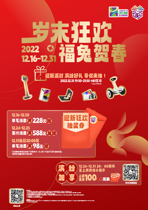 跨年夜迎新狂欢抽奖券大派送,i phone、戴森吸尘器、switch游戏机等缤纷好礼等你来抽!活动期间单笔消费满额即可获得抽奖券,会员享额外福利,积分兑换抽奖资格。