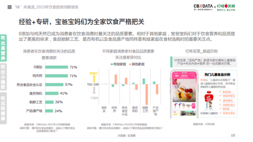 一般消费者对于食品饮料更关注“0添加”和“纯天然”这两项品质要素。而对于有娃家庭,全家人的餐桌营养价值可谓重中之重,因此在食品锁鲜工艺、是否有机、食品源产地等方面比其他家庭有更高的诉求。这一精细化需求也已被一些生鲜电商及时洞察:叮咚买菜就推出了「宝妈严选」频道,为家长们提供“儿童膳食产品+专业内容+服务”的一站式解决方案。其中优诺以“儿童成长定制配方”的高品质儿童酸奶破局细分市场,在此频道深受宝爸宝妈们的欢迎。