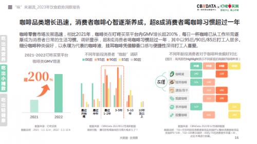 根据《报告》数据显示,85后更喜欢来点甜品烘焙给生活加点甜,95后新晋打工人则钟爱用咖啡“续命”,00后与75后志趣相投偏爱用酒治愈身心,而90后、80后已分别爱上吃水果、磕坚果的养生模式。