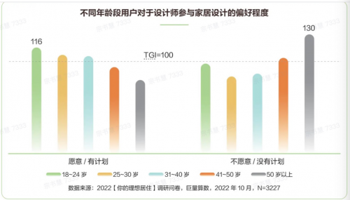 年轻人群对于设计师参与家居设计也表现出了较强意愿,18-40岁年龄区间内的消费者都有比较高的设计服务购买倾向。