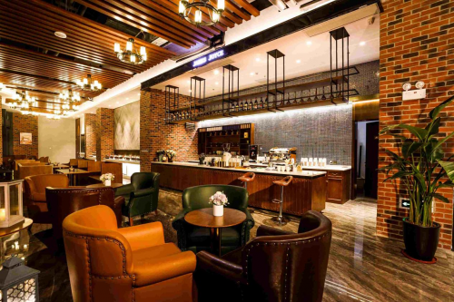 在喆啡大堂内,工业风红砖墙大面积铺设,木质家具映衬其中,呈现出典雅沉稳的空间氛围。