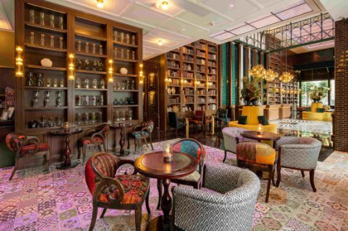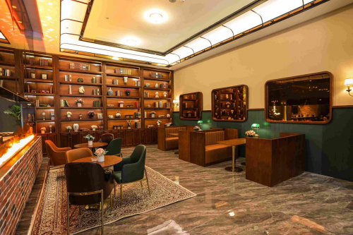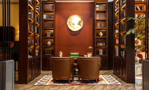 大堂内,曼哈顿风外墙与钢结构设计相辅相成,墨绿与深棕大面积铺设。融合会所、书吧以及威士忌&红酒&爵士餐吧等组合设计的多功能空间,嵌入式书柜古籍罗列,布艺沙发显现温润质感,打造思想与文化交锋的多元化场所,令消费者可在复古氛围的同时,获得精神上的满足与感官上的放松。