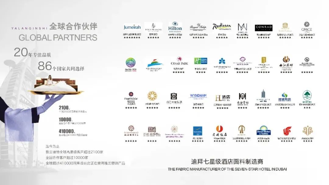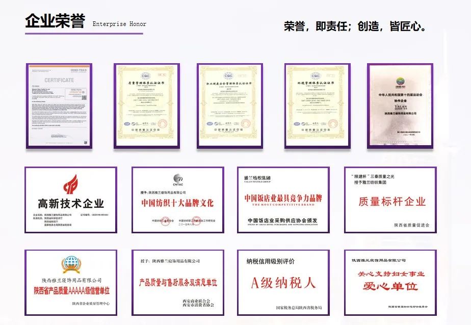 文化铸魂,品牌立企。雅兰纺织集团贴近企业实际,持之以恒地推进企业文化建设,经过不断探索实践、深入总结提炼、反复融合提升,形成了符合自身发展的企业文化体系,有效推动企业文明和谐发展,取得了丰硕成果。作为专注深耕布草产业20余年的专业品牌,雅兰纺织集团始终坚持“专注、厚德、感恩、致远”的核心价值观,秉承“创新进取、勇于担当”的企业精神,履行“创造舒适睡眠,造福更多人群”的企业使命,树立“打造国际优秀专业品牌,成就雅兰百年梦想”的伟大愿景,坚守“产品就是人品”的产品理念,不断深化改革,创新管理,推动各项工作扎实开展,企业品牌影响力和社会信誉大幅提升。