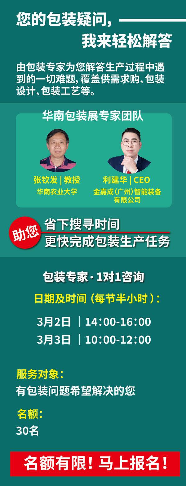 华南包装展现场将全新推出,免费咨询1对1专家,包装难题全部KO。前30位限免!先到先得!