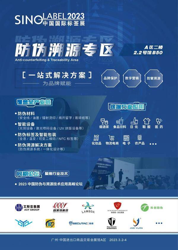 2023年展会继续深挖防伪溯源产业链,打造全新升级【防伪溯源专区】,展示众多硬核防伪技术产品,产品应用范围涵盖烟酒茶、食品饮料、日化、鞋服、医药、化妆品、物流电商、电子、农产品等领域。