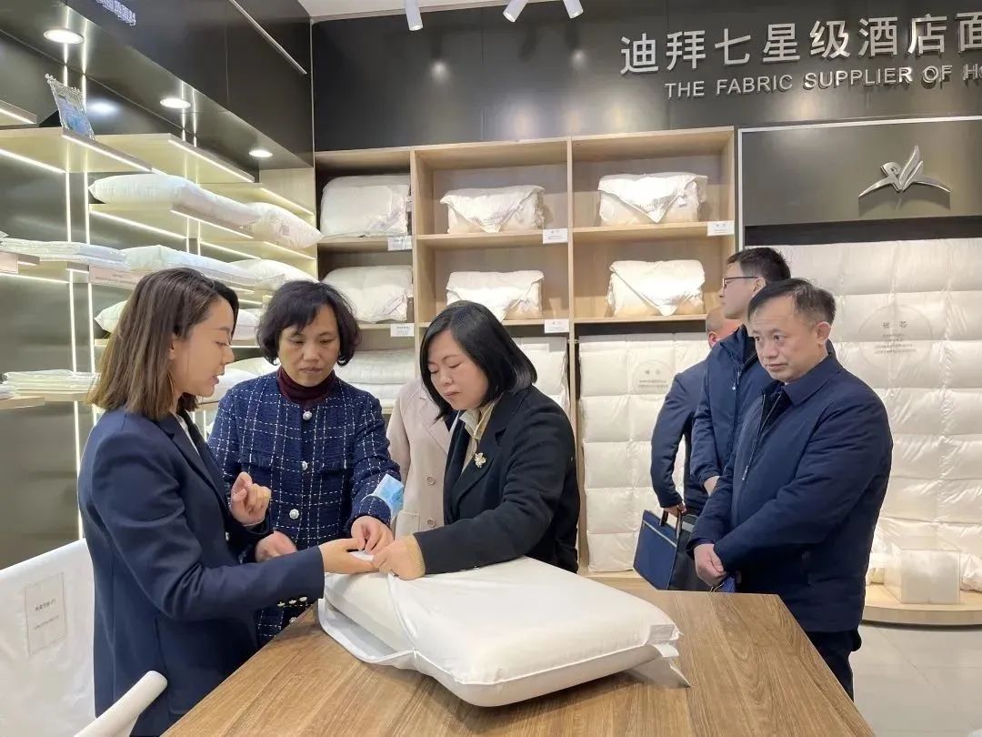 座谈结束后,孙崇博部长一行来到雅兰产品展示厅进行走访参观,在产品展示区前,陕西雅兰寝饰总经理屈娇详细地介绍了雅兰的产品种类、产品工艺、研发专利、产品标准以及东方御寝2023文创产品等情况。在实地参观考察雅兰产品面料、科技芯片和织造工艺的过程中,孙崇博一行对雅兰产品表示肯定并鼓励雅兰深耕科技创新,向科技要效益,向品牌要未来。