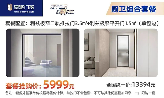 活动期间下定购买皇派门窗,首平可以享受99元/㎡,购满6㎡方可享受。
