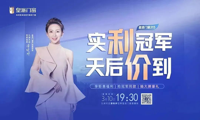 世界冠军九球天后、皇派门窗产品推荐官潘晓婷亲临直播间助阵,与您一同畅聊品质生活。直播现场设有无门槛互动抽奖;凡在直播间下单客户,还可参与订单抽奖赢取大牌壕礼。