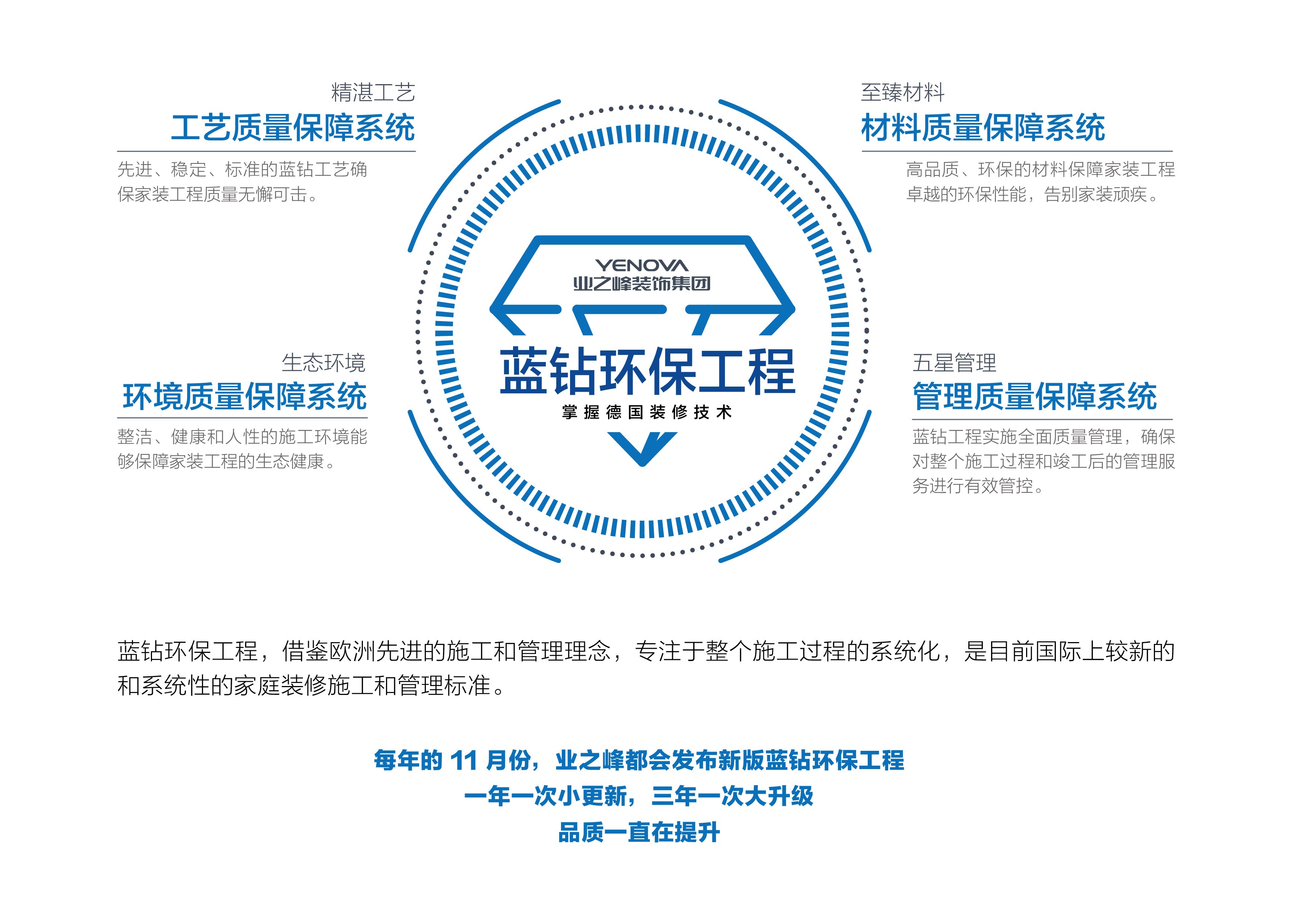 不仅如此,“蓝钻工程”每年还都会增加新型环保材料及先进工艺,不断进行优化和升级,始终以四大质量保障系统领引家装品质国际化。