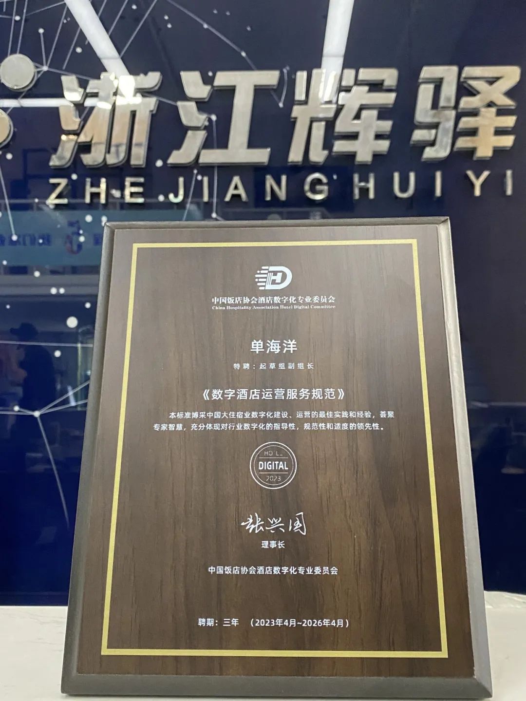 2023全国酒店业数字化增长峰会上,《数字酒店运营服务规范》团体标准启动,中国饭店协会理事长张兴国介绍了此次标准编制工作的背景,指出数字酒店运营服务规范标准的制定具有重要意义,杭州盈兴科技有限公司总经理胡俊杰被授予特聘专家,辉驿科技副总裁单海洋被授予起草组副组长。