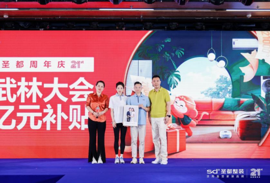 近日,圣都整装21周年庆典在全国100多家门店同步举办,狂撒亿元补贴回馈客户。杭州主会场更有奥运体操冠军杨威、杨云夫妇亲临助阵,与各位行业协会领导、家装同仁、媒体朋友以及广大客户共同见证圣都连续三年获得“全国整装销售额第一”的荣誉,共同为圣都21岁庆生!