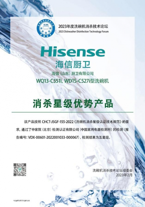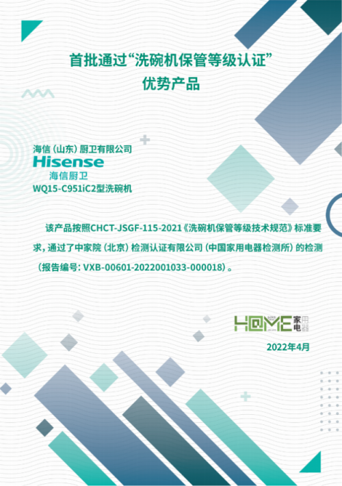 从2021年荣获中国质量认证中心“节水认证”、“节能认证”,到2022年荣获首家中家院一级保管等级认证,到2023年荣获中家院五星消杀等级认证、参与中国洗碗机国家标准的制定,海信洗碗机一直坚持品质与科技创新,围绕用户需求、不断迭代升级,始终致力于为用户提供高品质的智慧厨房解决方案。