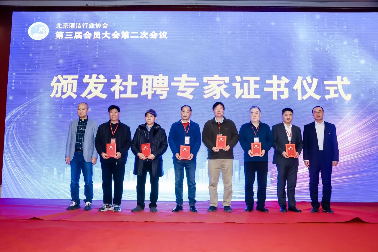 会议第三项议程,颁发社聘专家证书。此次大会为12位在党建工作、行业发展建设、安全生产、物业管理、石材护理五个方面有着专业学术造诣,为推动协会各项工作做出突出贡献的专家学者,颁发“北京清洁行业协会社聘专家”证书。未来,协会将继续携手这些专家学者,以智囊团的形式,共同为行业、产业发展建言献策,助力高质量发展。